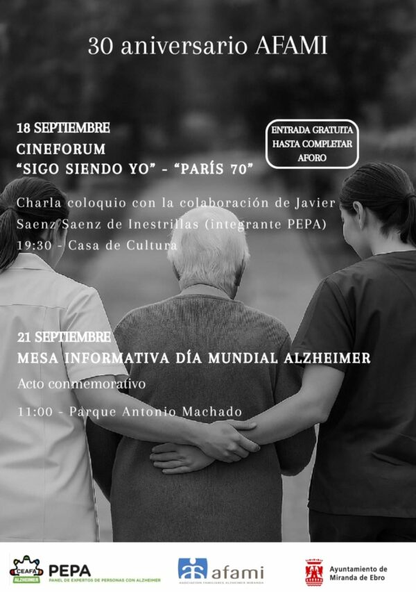 * Proyección “Sigo siendo yo” (jueves 18, Casa de Cultura). AFAMI proyectó el documental como parte de la programación conmemorativa. El acto contó con la presencia de Javier Sáenz, integrante de la PEPA (Panel de Expertos de Personas con Alzheimer), un claro ejemplo de que, tras un diagnóstico precoz, se sigue siendo la misma persona. Más detalles: https://www.elcorreo.com/miranda/afami-inicio-ayer-miranda-actos-dia-mundial-20250919235439-nt_amp.html