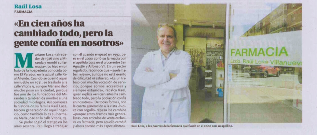 Mariano Losa, alrededor de 1926, vino a Miranda y montó su farmacia. Lo hizo en un bajo de la hospedería conocida como El Parador, en la actual calle Real Allende. Cuando se quemó aquel inmueble en 1931, se trasladó a la calle Vitoria 9, aunque Mariano dejó mucho poso en la ciudad, porque fue uno de los fundadores del Mirandés y también da nombre a una sociedad micológica. Así comienza la historia de su familia Raúl Losa, tercera generación de aquel negocio, como también lo es su hermana María José en la calle Vitoria 23.