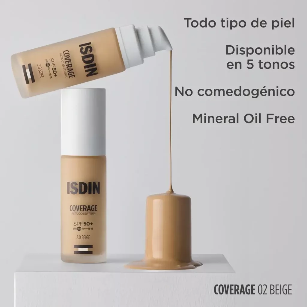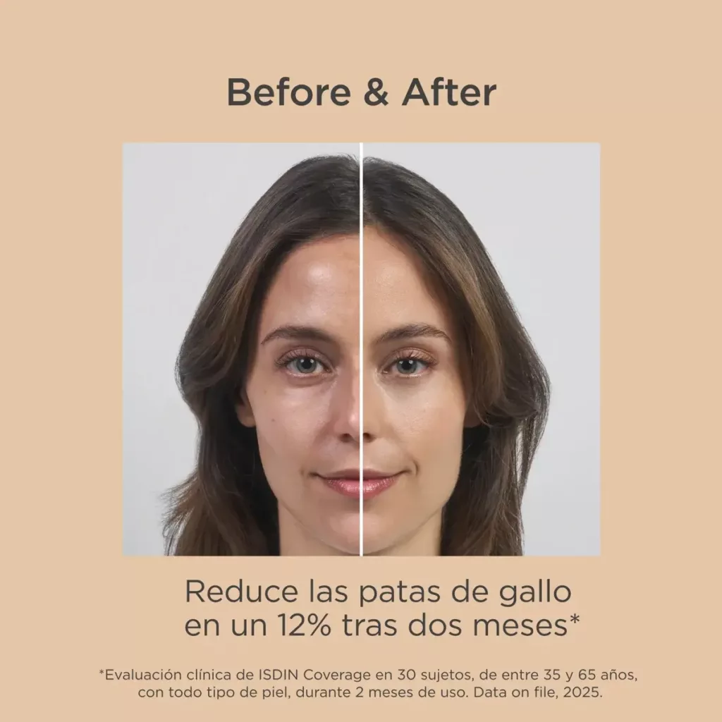 ISDIN Coverage es una base de maquillaje fluida multifunción que combina muy alta protección solar SPF 50+, cuidado antiedad y cobertura modulable en un único gesto diario. No es simplemente un protector con color: es un maquillaje con el rigor dermatológico de más de cinco décadas de experiencia de ISDIN en salud de la piel.