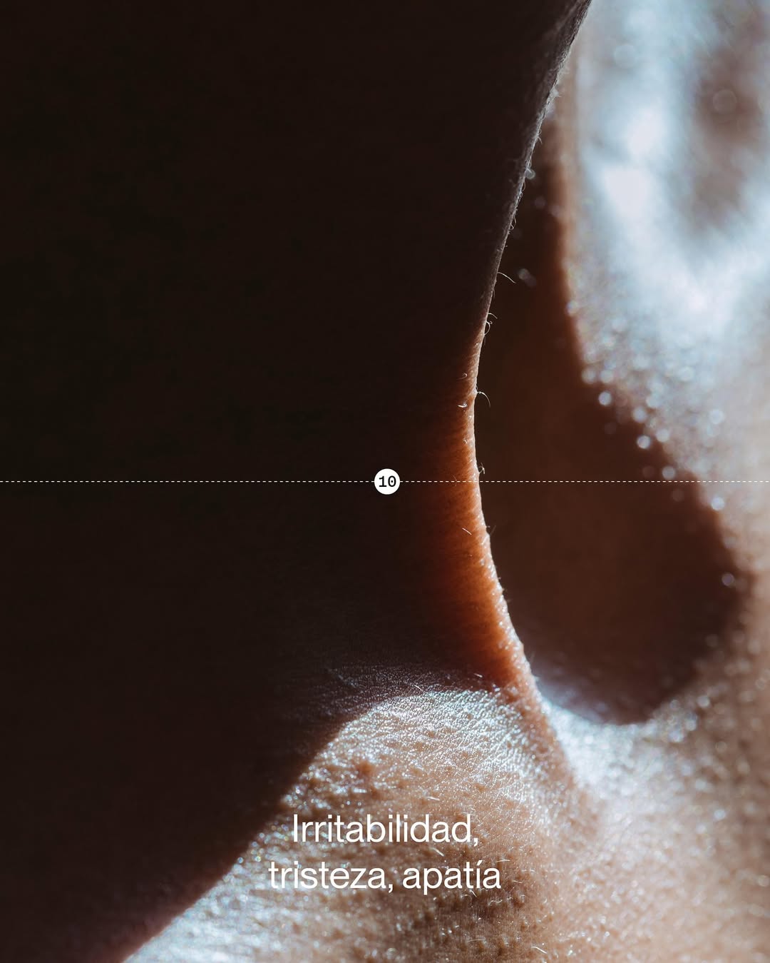 - Irritabilidad, tristeza y apatía: Ansiedad, irritabilidad y cambios de humor.