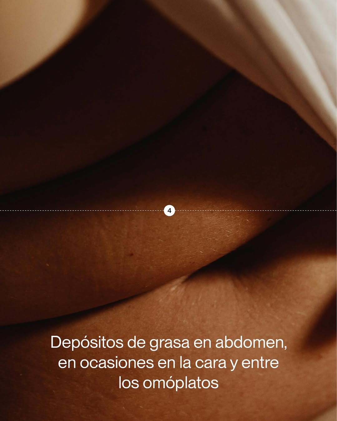 - Depósitos de grasa en el abdomen; a veces en la cara y entre los omóplatos: Aumento de grasa abdominal y/o
