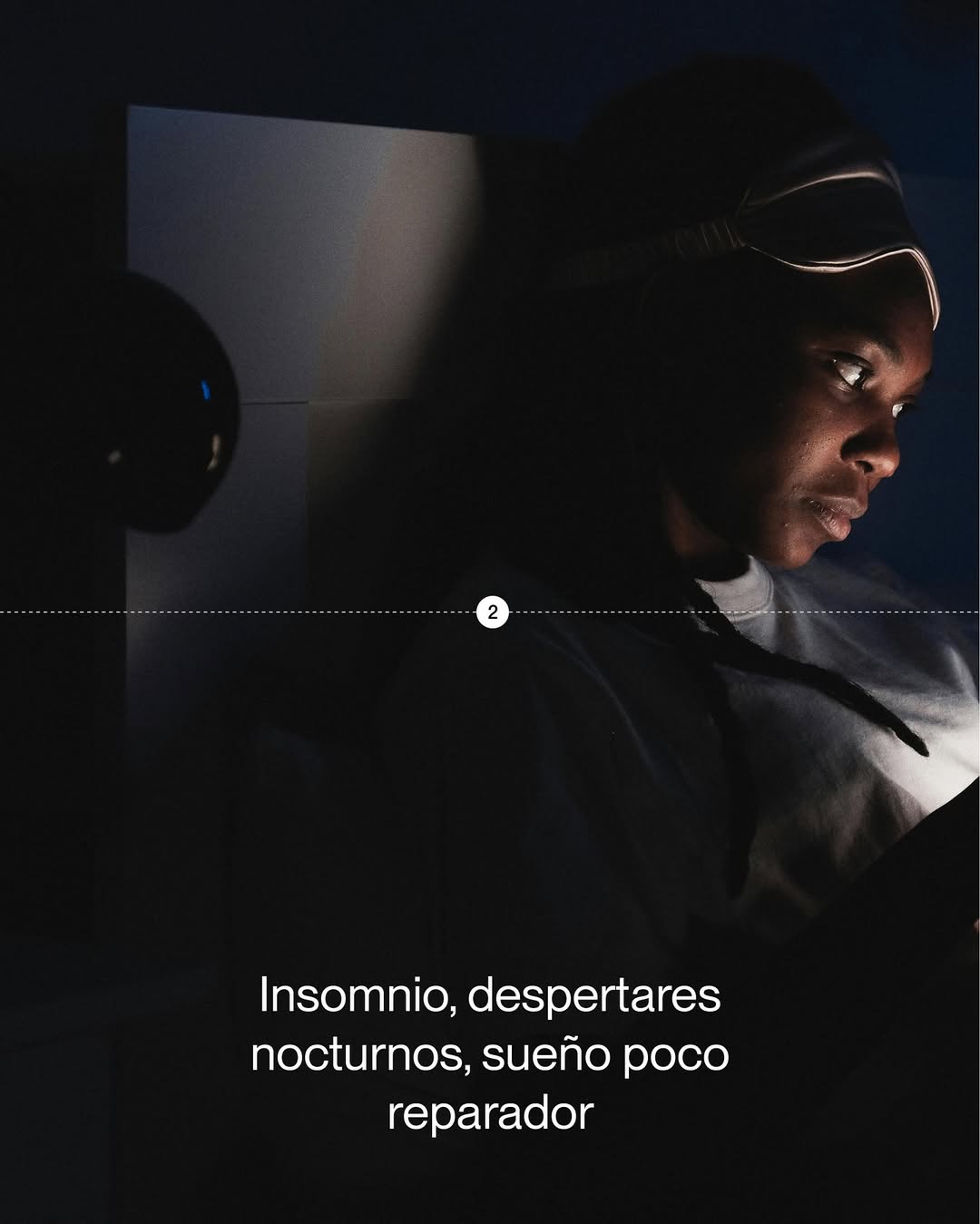 - Insomnio, despertares nocturnos o sueño poco reparador : Dificultad para conciliar, despertares nocturnos o sueño no reparador.